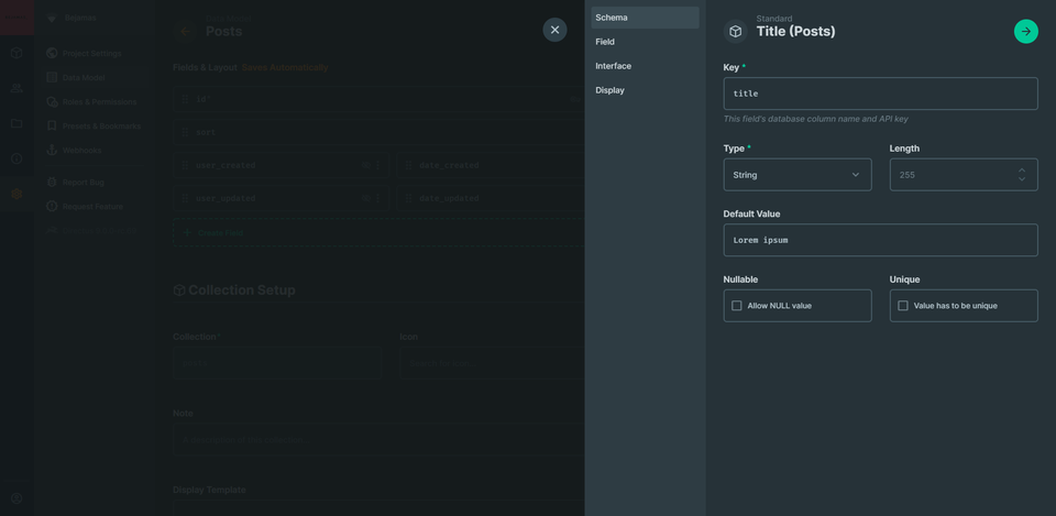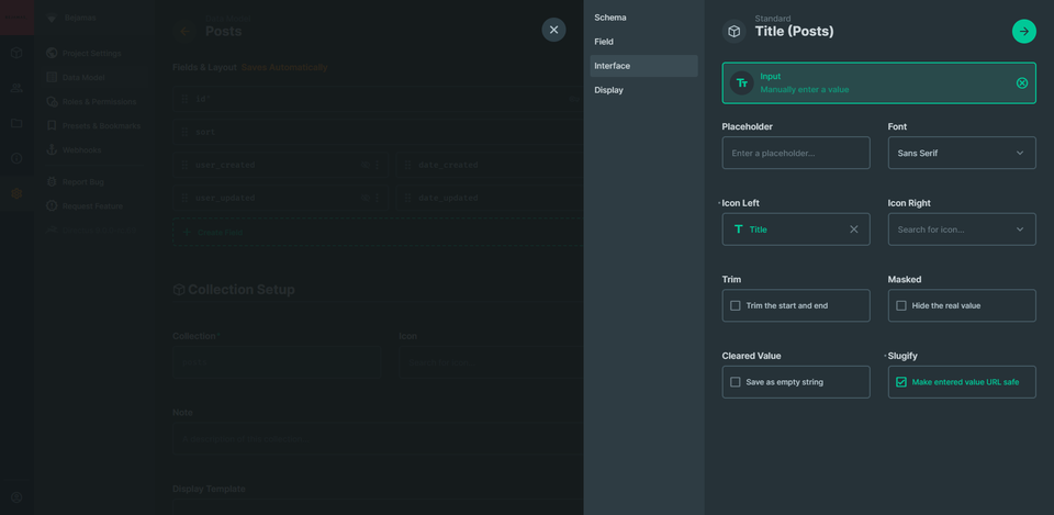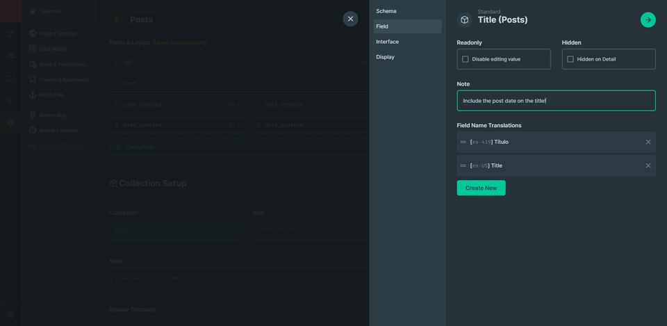 Here is where Directus gets awesome, after setting the field’s Schema we begin to set the Field in the interface, we can set if it’s Readonly if it’s hidden, add a Note and add a Field Name Translations we can use this instead of the field name in the database.