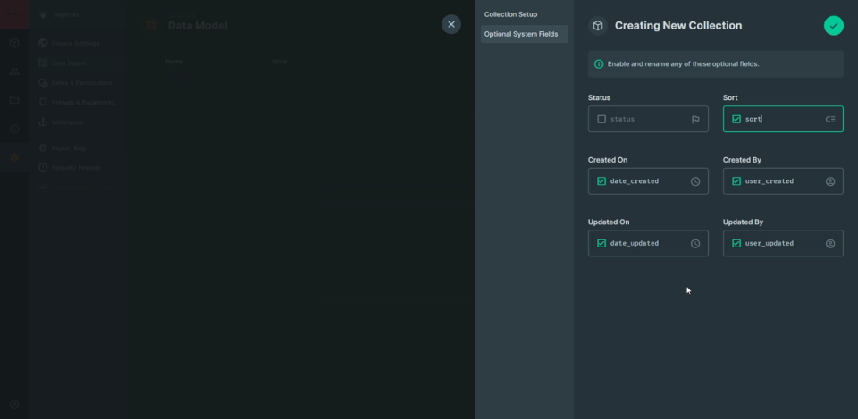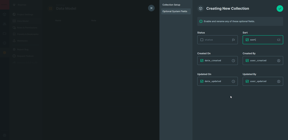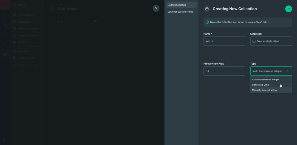 After configuring our collection (remember collections are database tables) we can add fields (database columns) to it.
