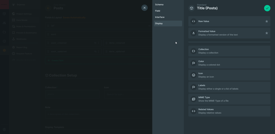 And finally, the display section which as the title states this is how the field’s value should be displayed, again Directus gives you a lot of options.
