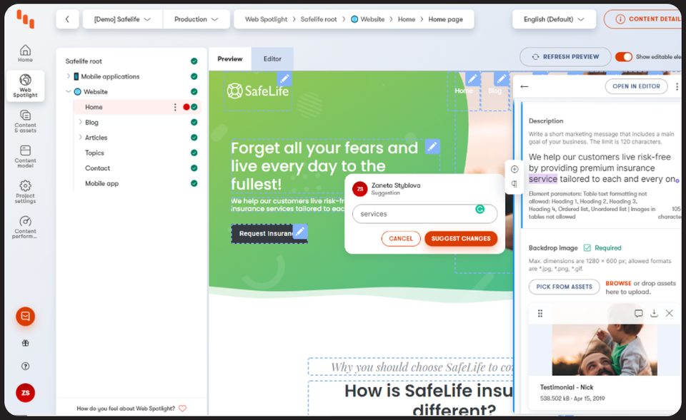 Worth mentioning here is one of the newest features of Kentico Kontent - Web Spotlight. It's a way to bring the Jamstack site right into the headless CMS UI. This is great for non-technical users - they are able to see and edit the site like they were used to from traditional CMSes.No more wasted time on waiting for the page to build to see the applied changes. Web Spotlight is giving editors a real live experience
