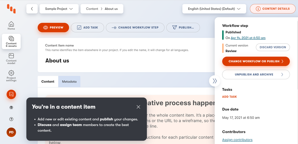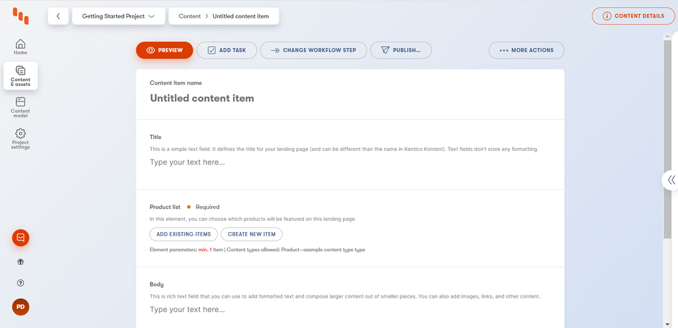 Kentico Kontent editors app is very user-friendly. It doesn’t require any technical skills. The interface is clean, modern, and intuitive. Upon your first visit to the editor app, you’ll be greeted by the brief introduction via helper pop-ups.