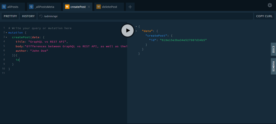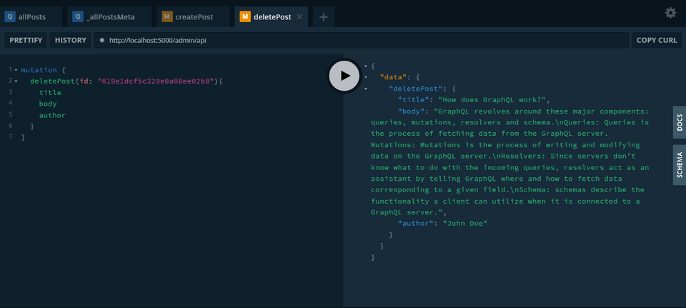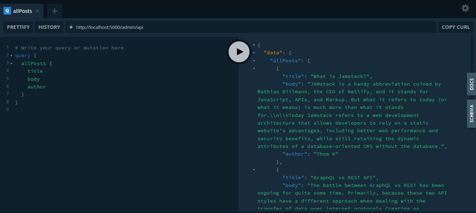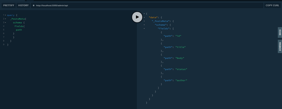 Keystone provides a GraphQL API where you can query your data as well perform mutations. To perform these operations, GraphQL provides a GraphQL playground where you can work around with different queries.