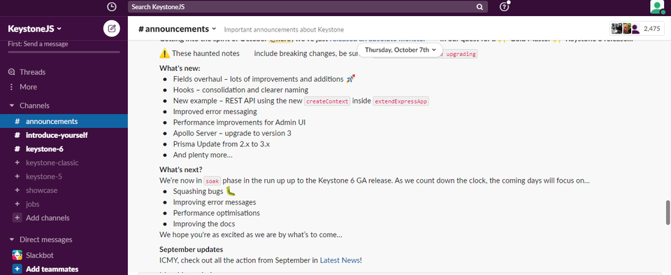 KeystoneJS has an active presence on Twitter including a personalized Slack channel that is dedicated to updating developers about their latest features and releases as well as addressing any issues faced by users . While KeystoneJS is a product of Thinkmill, it has a thriving and inclusive community of developers who contribute to this project by adding their inputs and suggestions.