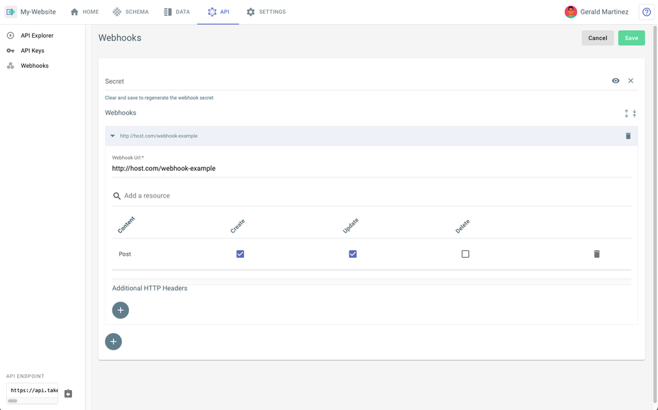Webhooks Allows the CMS to send real-time notifications to other systems or services when certain events happen (e.g., content published). You can use these to trigger actions in other applications. | ||