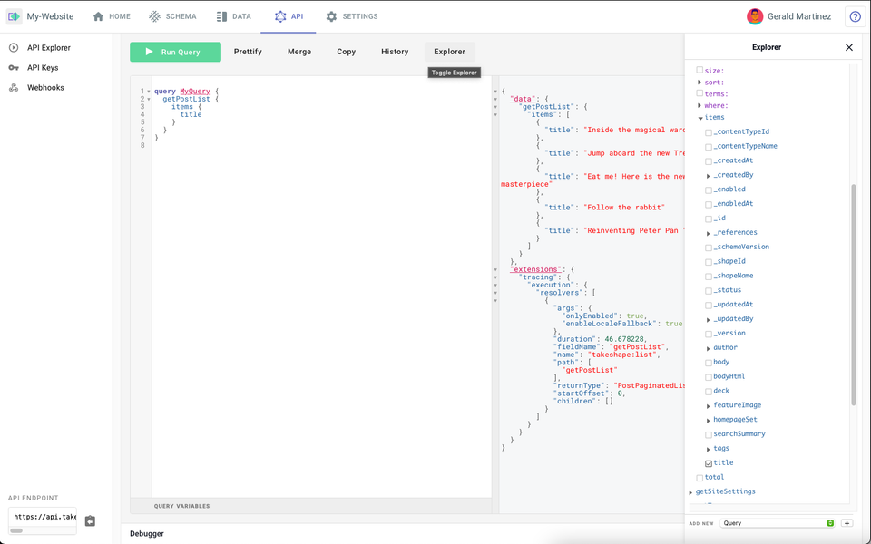 In the admin interface of TakeShape, there is an API explorer where you can see your project's GraphQL API. You will have great features like generated documentation, write queries, and measure query performance. The one thing that caught my attention was that you can easily add mutations and use the API explorer to run them. This feature is really great because many other CMSs use the API explorer just to run queries.