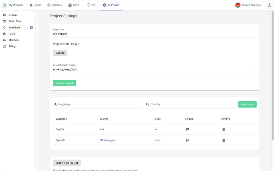 Here you can manage all the things related to your projects like your sites, workflows, roles, members, and billing.