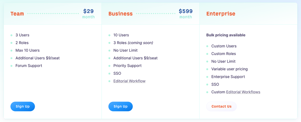 Business: Geared towards businesses, the Business plan is available at $599 per month. It includes 10 users, 3 roles (coming soon), and no user limit. Additional users can be added at $9 per seat. This plan provides priority support, single sign-on (SSO), and an editorial workflow for enhanced content management.