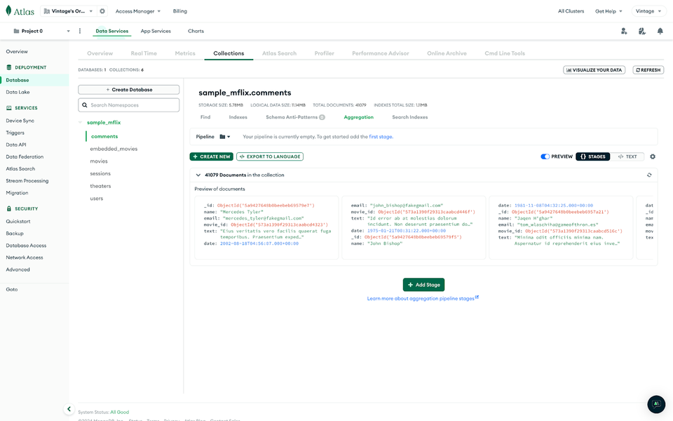 MongoDB lets you perform aggregation on the Atlas UI. Select the database and the collection you would like to perform aggregation operations. Click on the aggregation tab.