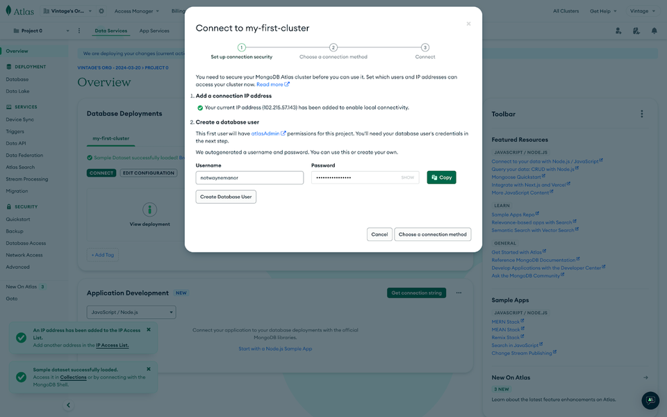 Click on Create Deployment. On the next page, you will be prompted to set up a database user for your new cluster. Enter a username and Password, click on Create Database User, and progress to the next step on the form, where you will select a connection method.