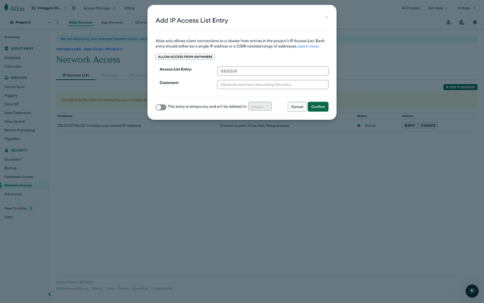 You can also control the IP access list in your database. On the sidebar, click on the network access; on the page, click on “+ADD IP ADDRESS.” this triggers a modal; you can fill in the details with your IP address or 0.0.0.0/0, which is a wildcard IP that allows access from everywhere.