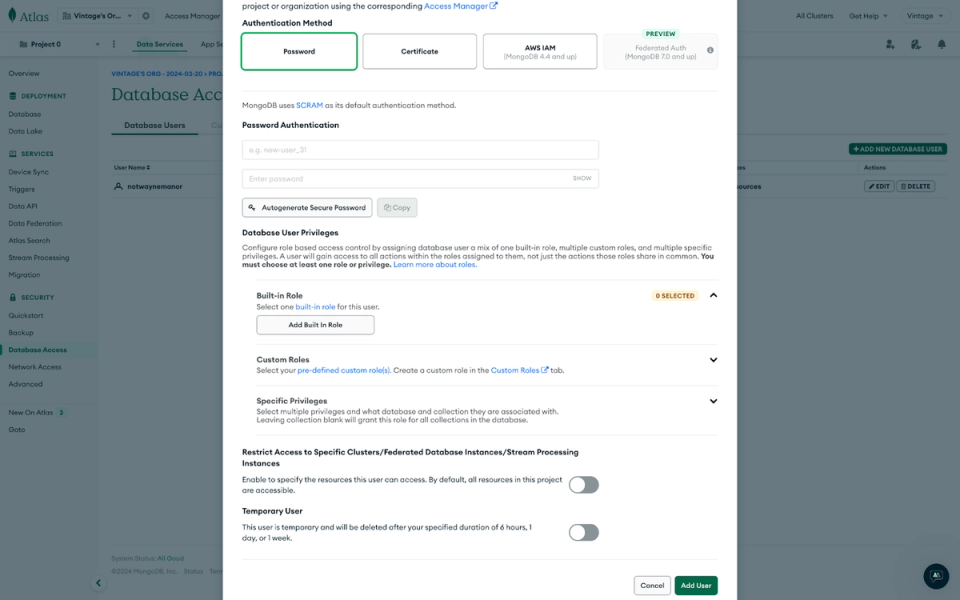 The modal has four Authentication options: Password, X.509 certificates, AWS IAM, and Federated Auth. We will walk through how to add a user with password authentication. In the authentication options, select Password. Enter the username and Password, and choose a role for the user. Atlas gives you the option to create a temporary user with access that expires in six hours, one day, or one week.