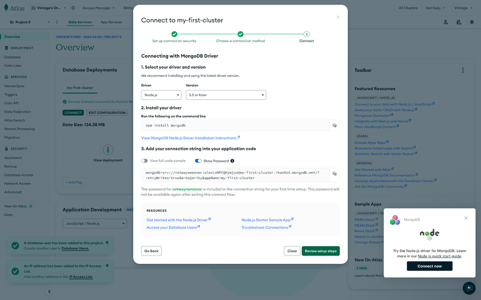 In the next step, select “Driver” as a connection method and proceed to the last step, where you will receive instructions on how to connect to your MongoDB Atlas database with the connection string.