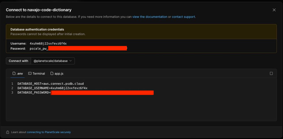 You can find credentials in the PlanetScale dashboard under the “Connect” button.