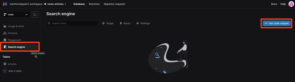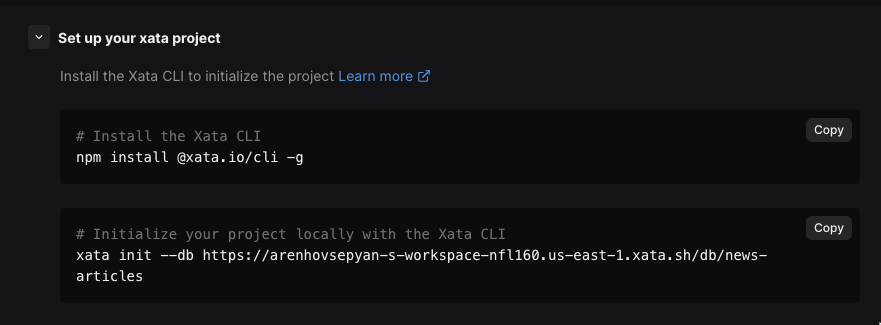 xata init --db https://arenhovsepyan-s-workspace-nfl160.us-east-1.xata.sh/db/news-articlesYou can find this command under the Search Engine section in the Xata dashboard.
