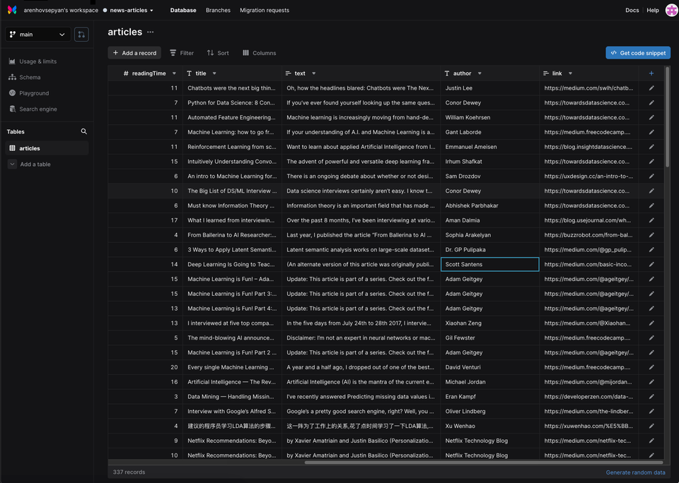 Let’s prepare a database of Medium articles from the following Kaggle dataset. In order to easily import data from a CSV file to the Xata.io database, you need to simply install the CLI tool and run the following command: