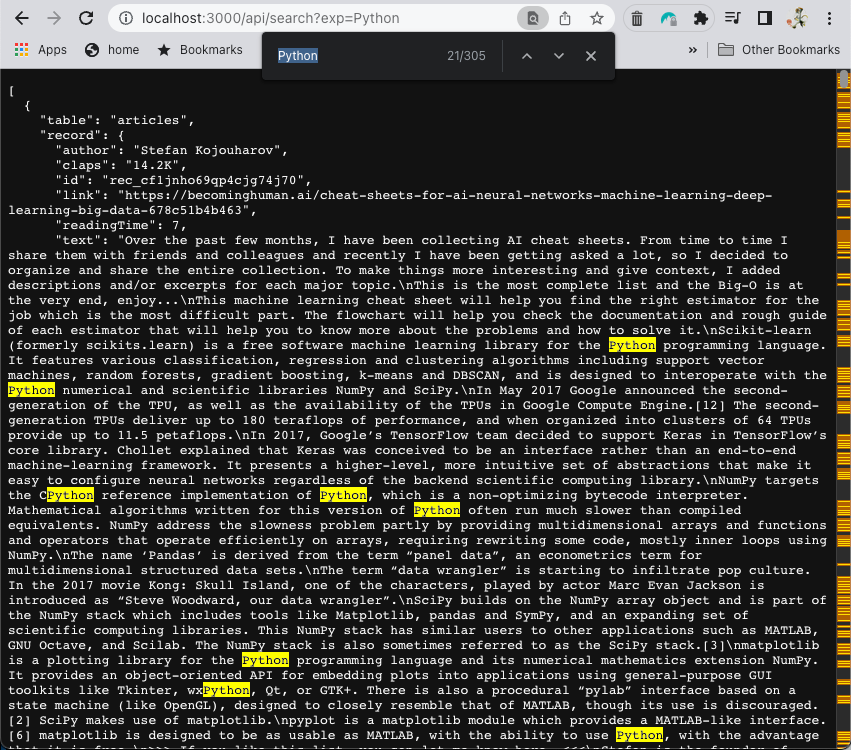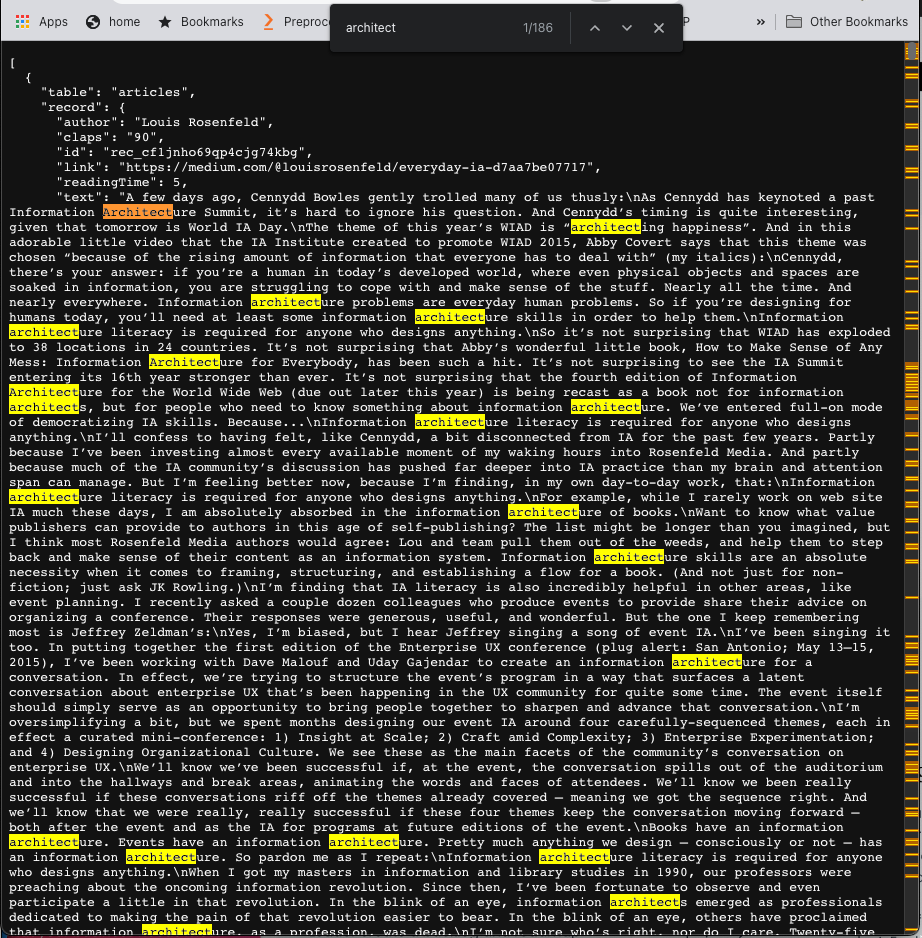 Let’s search all articles that contain the term architect, and we see JSON responses of articles that contain the word architect.