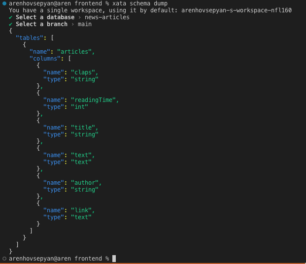 In order to check the autogenerated schema we can run the following command: xata schema dump, which shows us the JSON definition of our schema as follows.