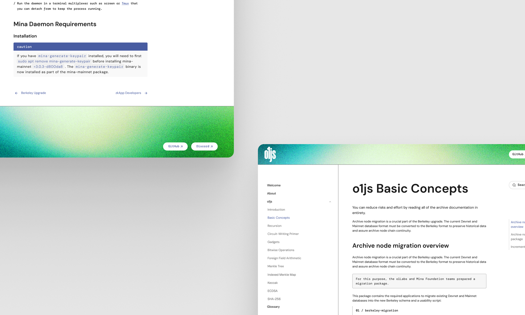 O1JS pages lived inside the Mina protocol documentation. Developers often weren’t sure which content applied to the library and which applied to Mina itself.